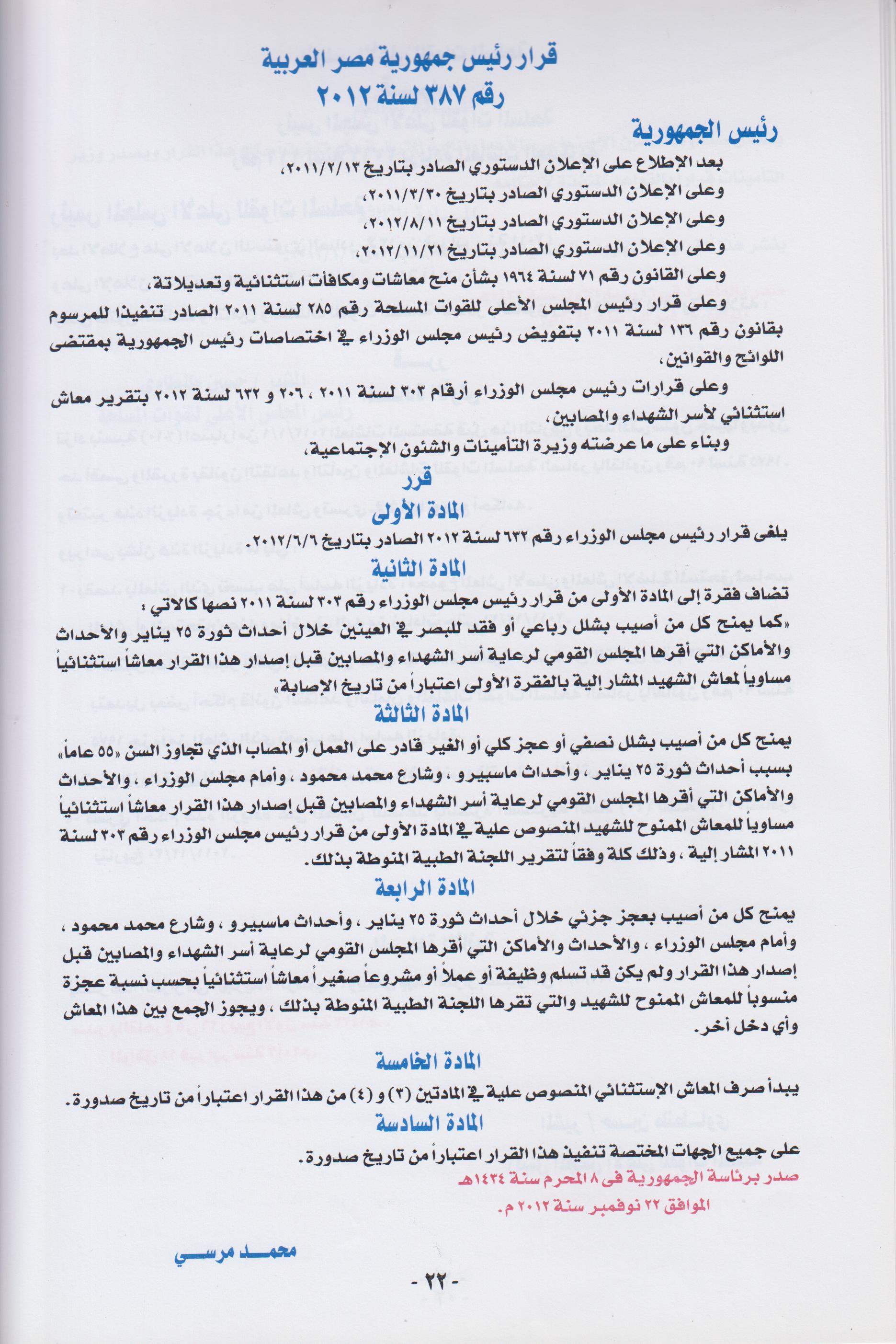 الغاء قرار رئيس مجلس الوزراء رقم 632 لسنة 2012 وتعديل قرار رئيس مجلس الوزراء رقم 303 لسنة 2012 ومنح مزايا لمصابي وشهداء الثورة