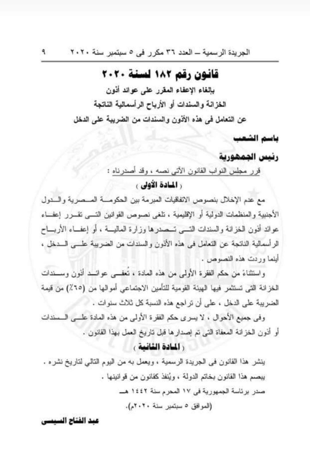 بالغاء الإعفاء المقرر على أذون الخزانة والسندات أو الأرباح الرأسمالية الناتجة عن التعامل فى هذه الأذون والسندات من الضريبة على الدخل